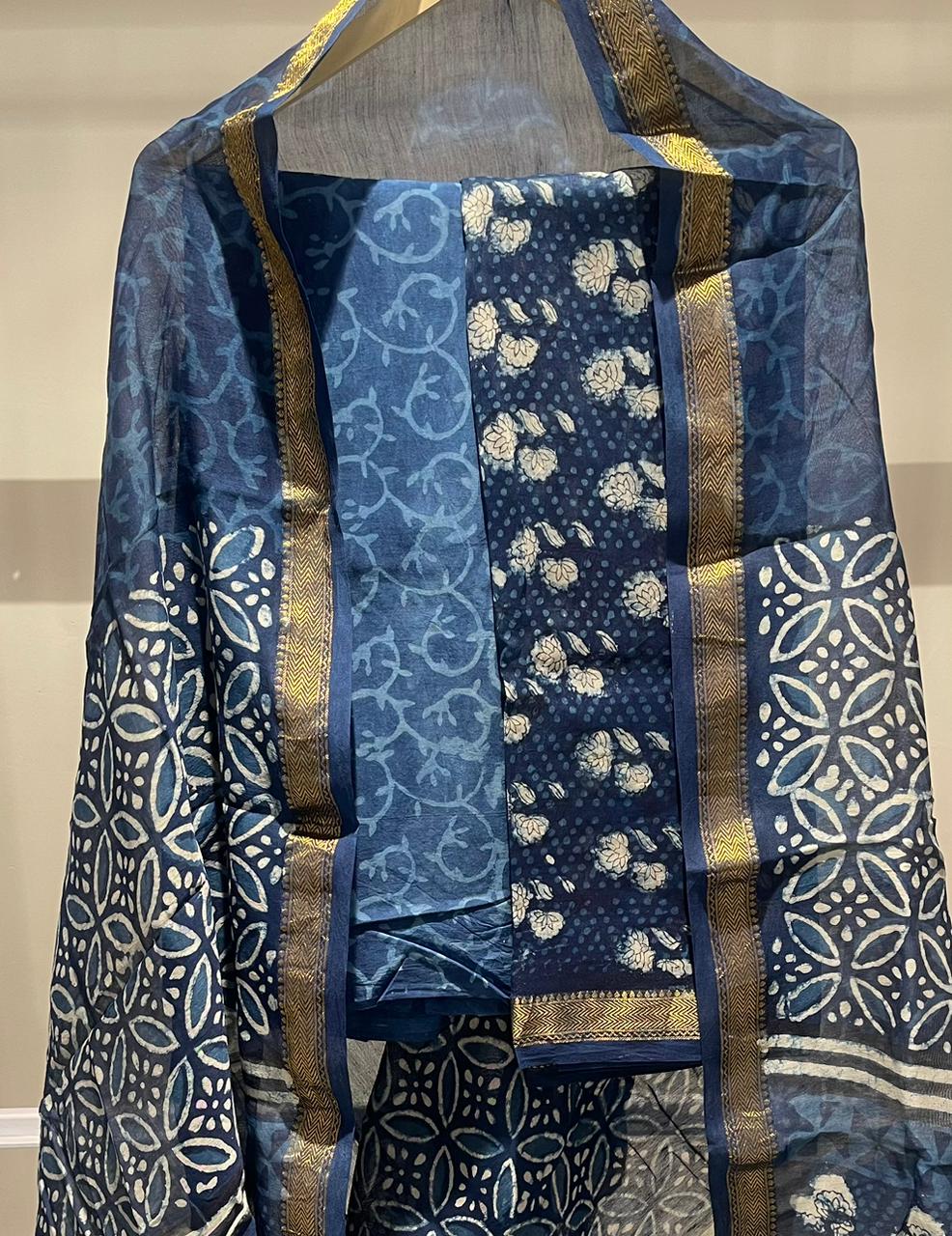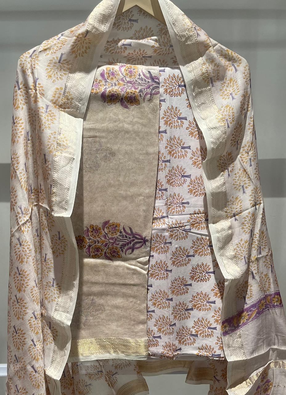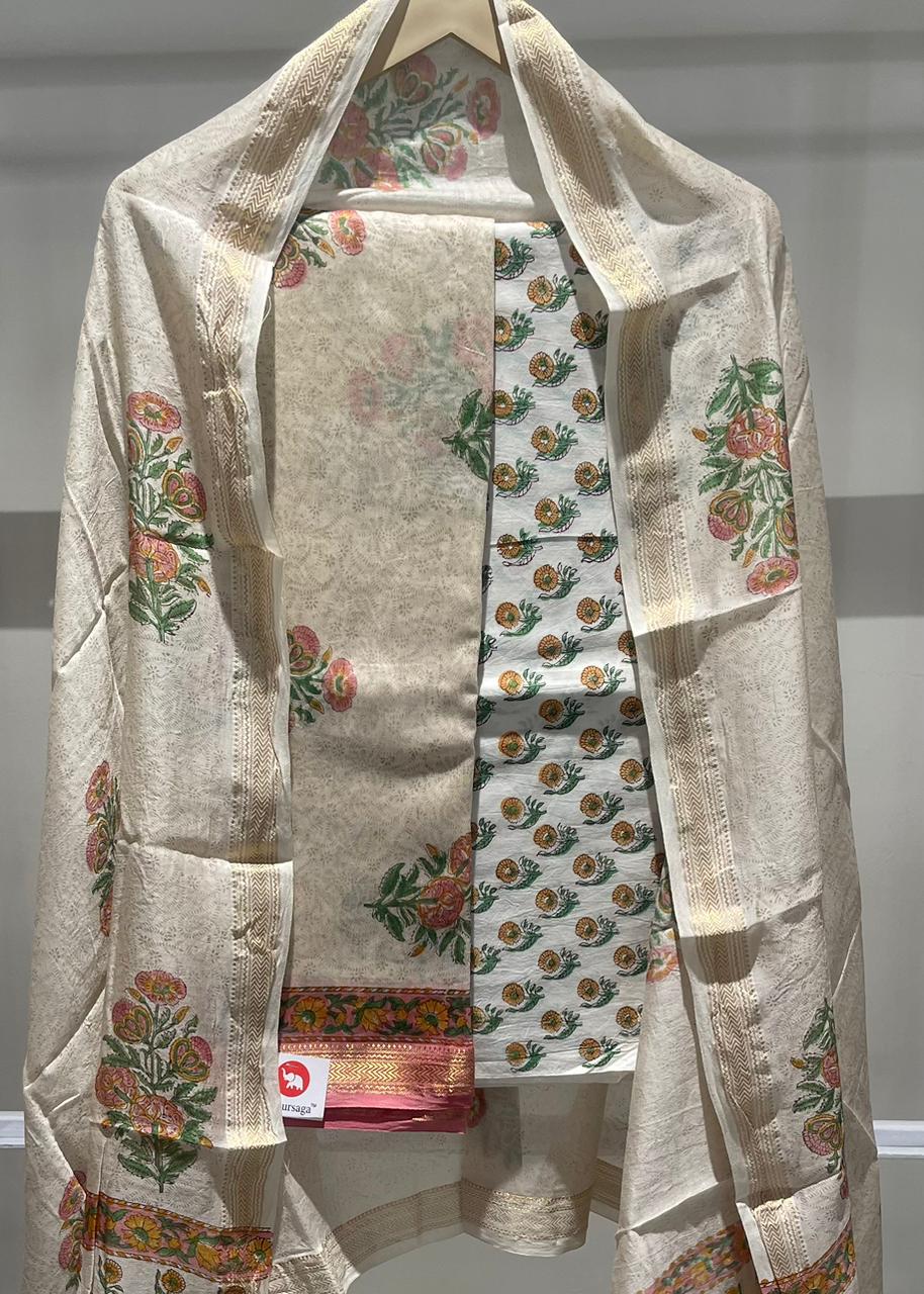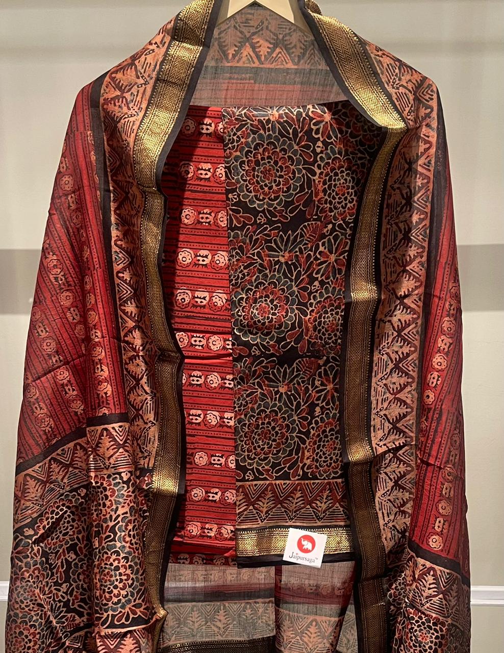 Mughal Hand Block Printed Maheshwari Silk Suit Set